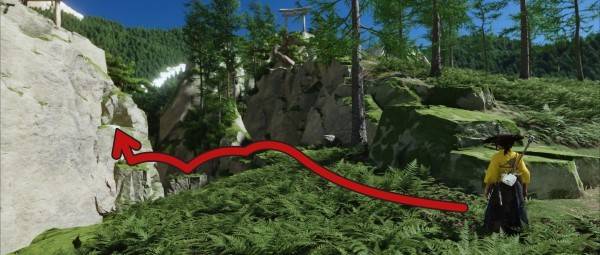 在爬神社的中途进入上层区域后,来到一片有鹿群和蕨类植物的开阔区域,这里正常路线是沿着坡道继续走。先不要继续,左转利用岩石平台到达岩壁处,通过岩壁上的攀爬点来到可侧身通过的缝隙。