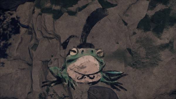 在尽头转动视角,即可在岩石上看到一幅青蛙壁画,拿着杯子头戴黑色礼帽,致敬了《狡狐大冒险》中的反派青蛙罗利爵士。