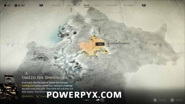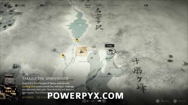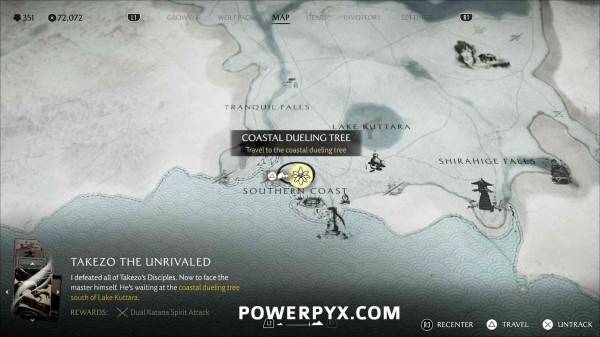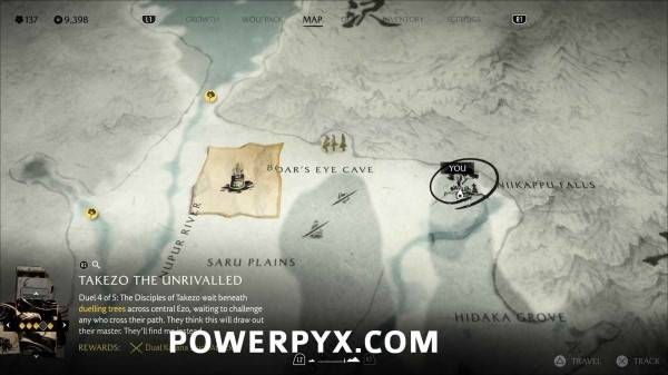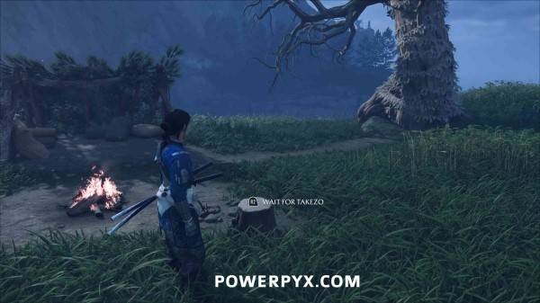 完成以上五处决斗树后,此位置会以任务目标标记显示在羊蹄草原南部。通过地图追踪跟随微风指引,前往悬崖顶端。与篝火旁边的树桩互动等待武藏,随后与武藏前往海滩开始决斗。