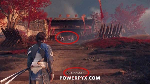 【对峙】选项并不是一直有的,一般在接近敌人数量较多的一群敌人时,或是一场战斗中仅剩少数敌人时触发。这里介绍一个比较容易触发的地点是在石狩平原,前往石狩城的入口处。城堡前有一群敌人会触发对峙选项。如果已经清完了此城,则可以找到任意羊蹄六人帮营地触发。如果已经完成了所有营地,也可以在开放世界中寻找随机出现的敌群来解锁此奖杯。
