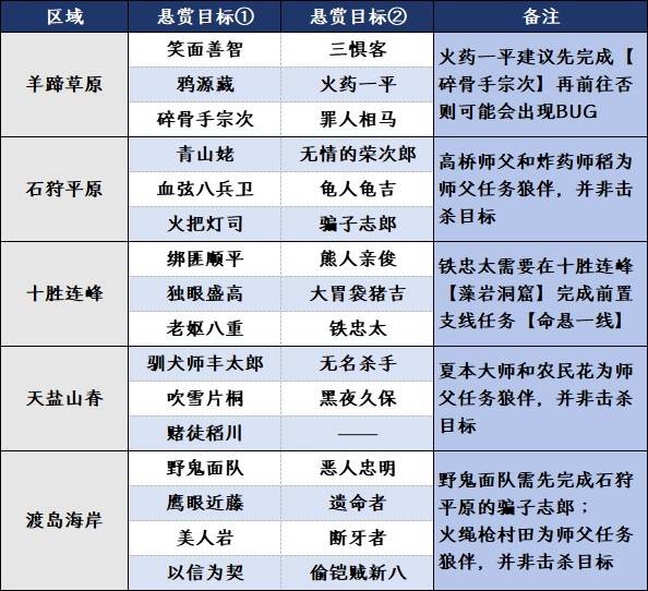 本作中总共有31个悬赏任务,全部都是奖杯【追缉大师】的解锁条件。悬赏可以从各区域客栈的悬赏板接取,完成前一任务后解锁新悬赏。接取后通缉令会在大地图标注指引搜索区域,前往区域内找到特定目标并消灭即可完成。如果找不到目标的话,可以参考这篇全悬赏位置攻略。下方为速览,方便大家对照查漏补缺。