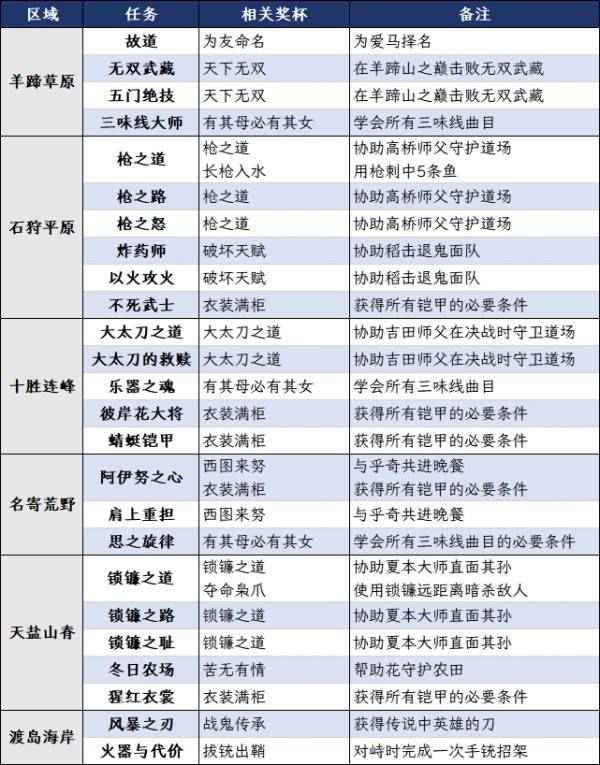 主线后清理剩余的支线/师父/传说故事。建议在做悬赏与收集前完成此类任务以解锁全部武器防具。以下为所有奖杯相关支线任务,未列出的即可忽略。