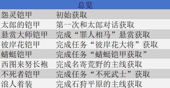 《羊蹄山之魂》全铠甲收集图文指南 全铠甲位置一览七玩网2025-10-7更新59次阅读关注 《羊蹄山之魂》本作的服装与铠甲除了赋予角色不同的外观,还会让角色拥有更多好用的被动效果,下面为大家带来《羊蹄山之魂》全铠甲收集图文指南,希望能帮助到大家。 怨灵铠甲 总览表 随文章内容更新。 外观 获取方法 初始铠甲,无需获取。 羊蹄山之魂羊蹄山之魂攻略