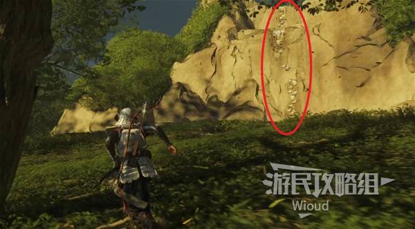 来到目的地,发现祭坛在独立的石柱上,注意石柱旁边的高地,贴着高地底部边缘走,有个可以往上爬的节点。