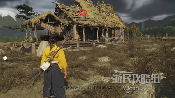 回到现实跳到房顶,在下图红圈所示位置捡到服装【十兵卫遗失的头带】。