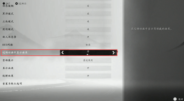 ※打开主菜单,进入显示选项单,过场动画显示头盔选为【开】,这样及时在剧情过场时,头盔仍然会罩住女主的脸。