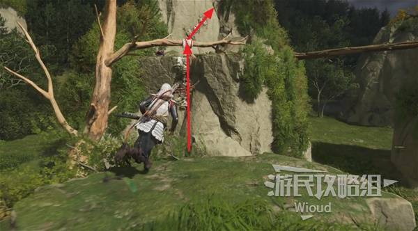 通过右边可用钩爪跳上去的树枝走到区域中心。