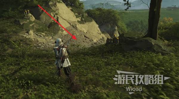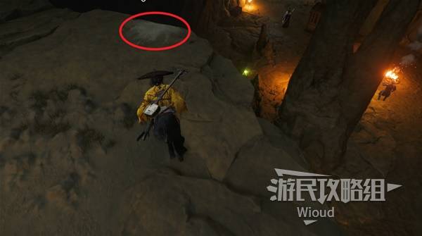走出洞穴朝后看,沿着墙壁上的攀附点移动到顶部找到眺望祭坛。