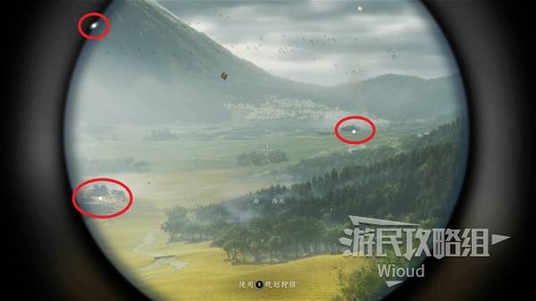 战斗结束画面一转来到羊蹄山区域,走到远处悬崖边使用望远镜,需要标注三个地点,如下图所示。