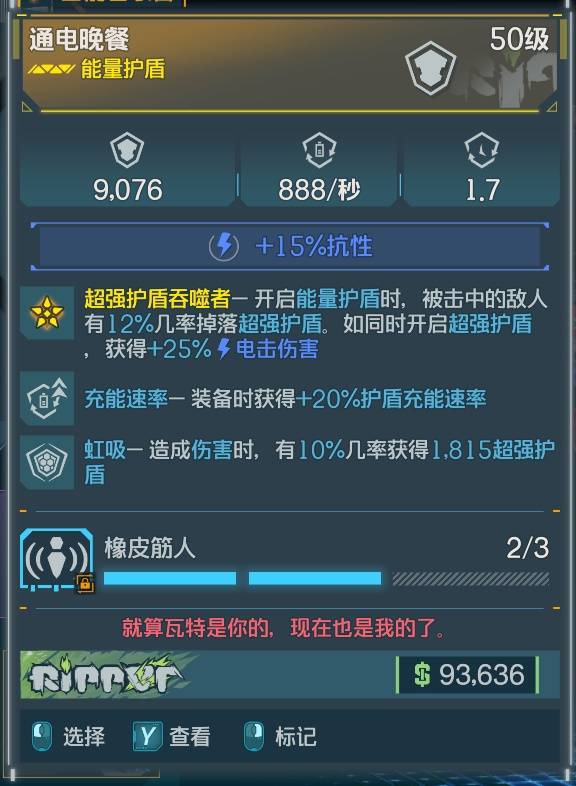 盾选择开颅者的通电晚餐,词条刚需一个虹吸,最好是10%概率触发超强护盾,另一个词条随意,通电晚餐提供的超强护盾一来可以有效提升生存能力,二来电伤加成可以提高输出,同时搭配蓝系的传导力和嘉年华,高效给怪上电击异常,从而达到延续主动的目的,可以说是本bd的核心套件。