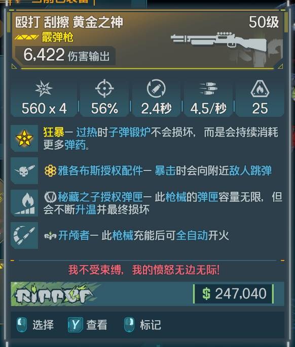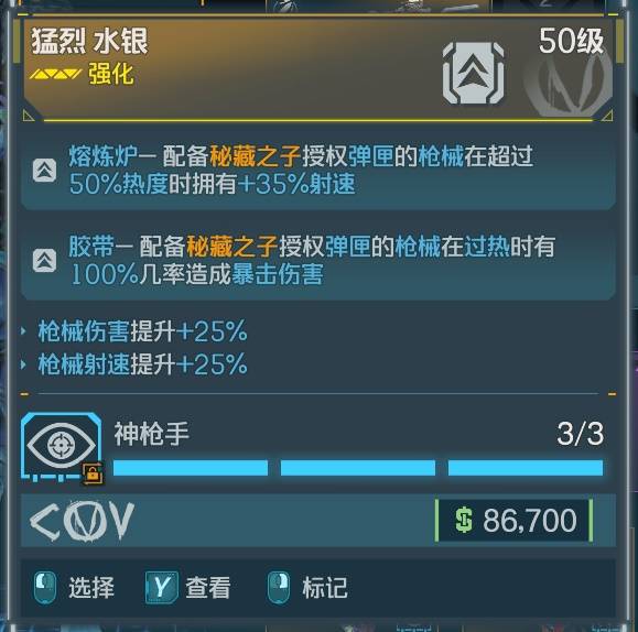 强化选择秘藏之子的水银,主要目的是利用过热百爆高效触发雅各布斯配件,大幅度提高黄金之神的输出,黄金之神融化boss主要就是靠水银和雅各布斯的combo,水银上最好带一个射速加成或者霰弹枪射速加成,毕竟射速对于黄金之神来说基本等于高贵的独立增伤,当然没有也问题不大,可以考虑刷一把射速比较高的黄金之神。