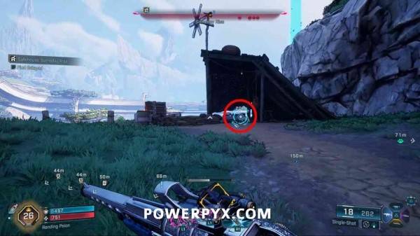 在地图标记图标后按【十字键-上】开始导航,拾取带蓝色标记的小型容器投掷到塔底控制台,然后爬到塔顶拉开墙板获得道具。