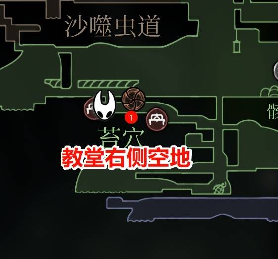 1.圣堂倾颓君威下:苔穴颓败教堂左上方,三蜗牛所在房间右侧空地(棕色图标所示位置)