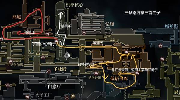 灰沼酒馆劈气球进入罪途,进入脑残腐汁泽,弹琴指路(也许可以不弹琴?没了解)进入管风琴。