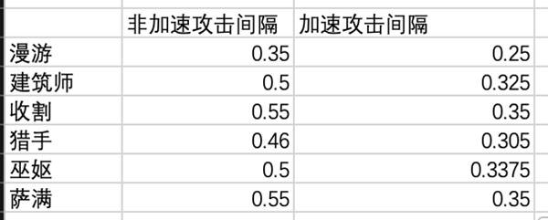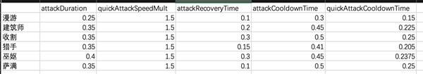 那么攻击间隔呢?很简单,非加速的攻击间隔 = MAX(attackDuration,attackCooldownTime+0.05),加速的攻击间隔 = MAX(attackDuration/quickAttackSpeedMult,quickAttackCooldownTime+0.1)