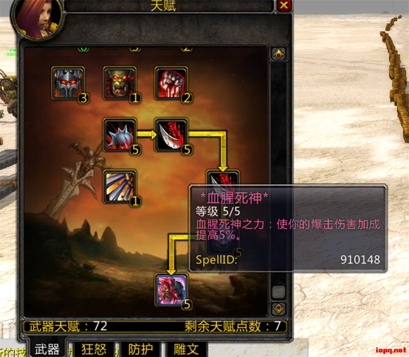 血腥死神(5/5):暴击伤害提升1%/2%/3%/4%/5%。(需要60点武器天赋和5点战神力量天赋)