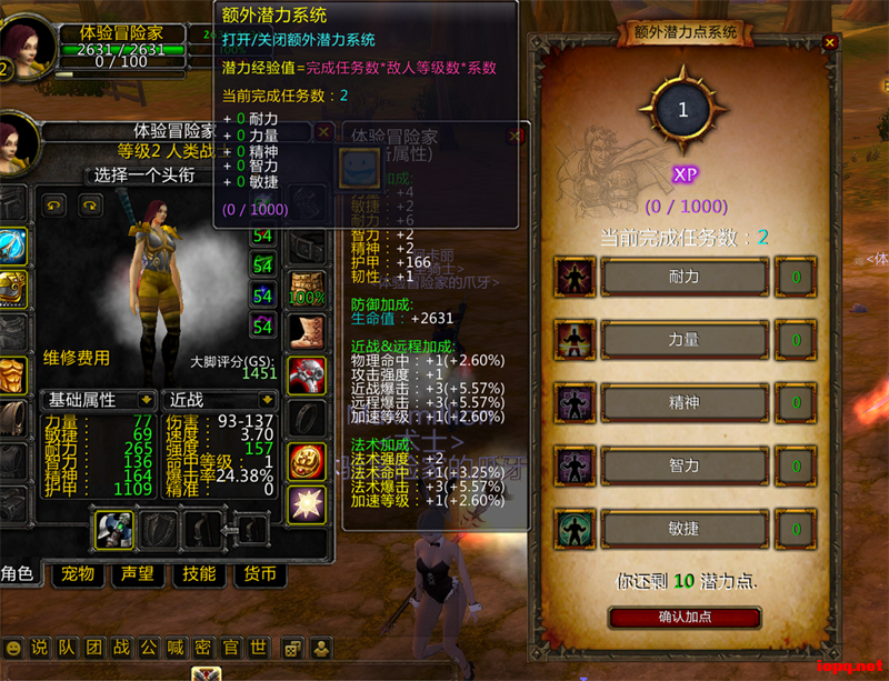 4:额外潜力点系统:(额外属性点账号通用)杀怪会获得完成任务数*敌人等级*系数的额外潜力点经验值。经验值满即可升级额外等级